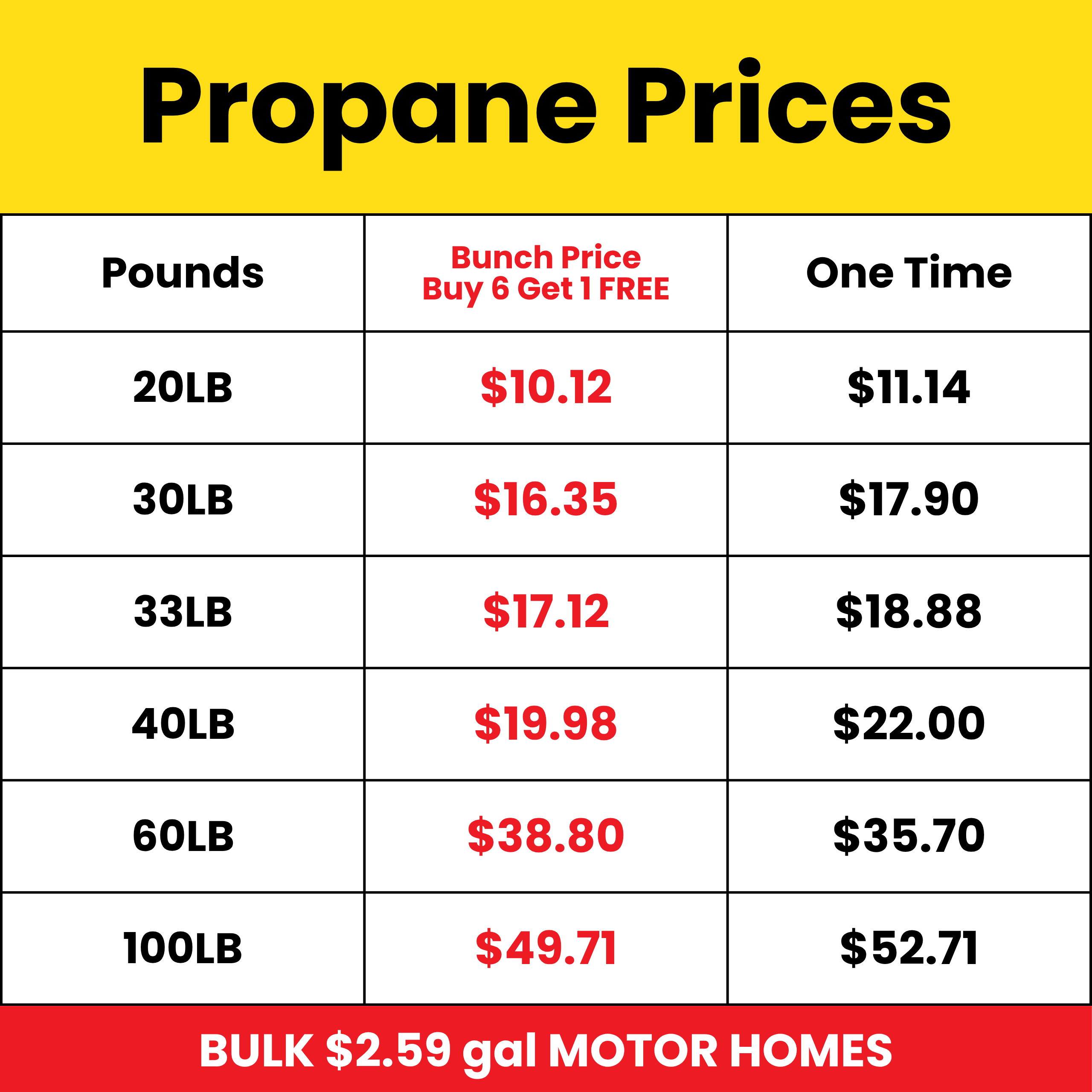 Gib’s is also your go-to store for propane at the lowest price available anywhere. The rising cost of propane can be hard on your wallet. Come to Gib’s every time and save! After six refills, your next one is free.